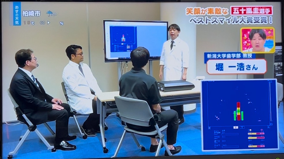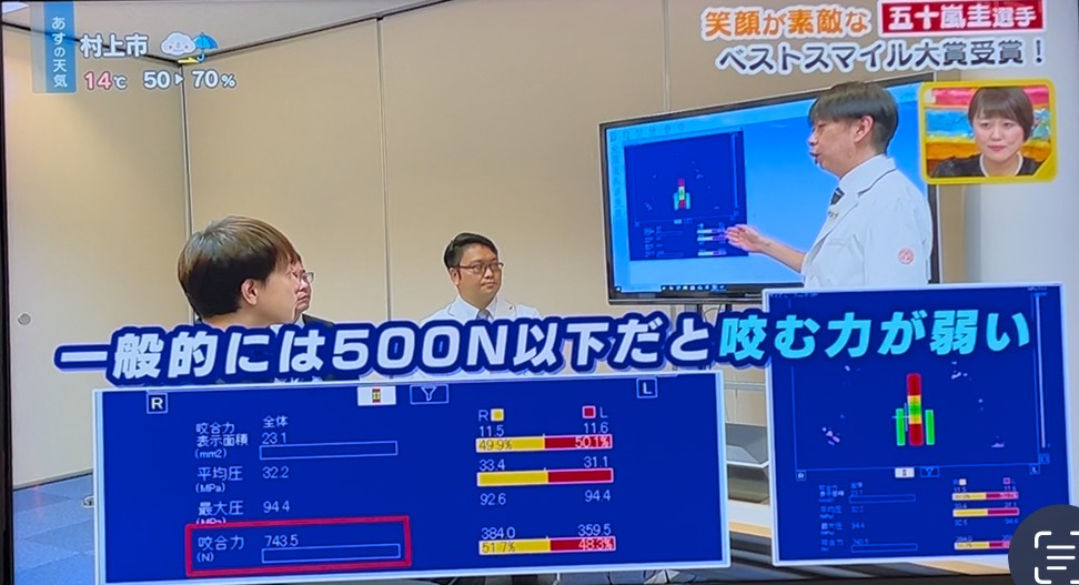 「いい歯でにいがたを元気に。笑顔で幸せ、ベストスマイル賞」を受賞した、新潟アルビレックスBB五十嵐圭選手の咬合力を測定しました。 |