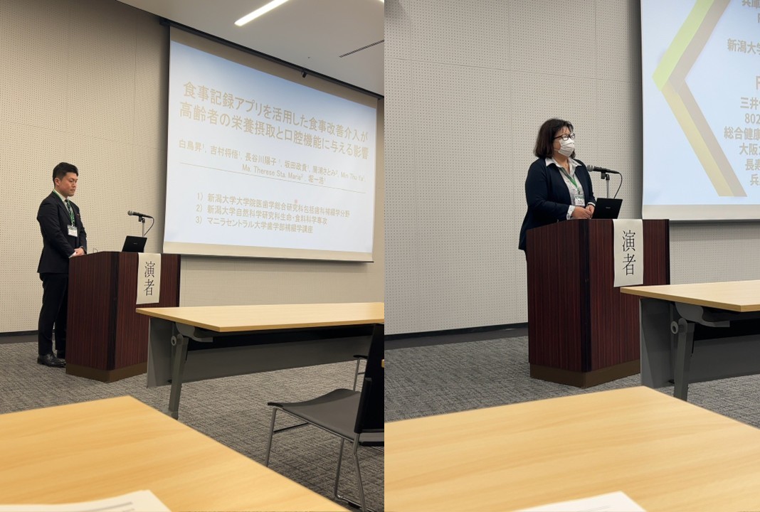 堀先生が講演しました。「とろみ調整食品を科学する」 菅沼先生が発表しました。「深層学習を用いた画像認識による口腔粘膜湿潤度の評価」 |